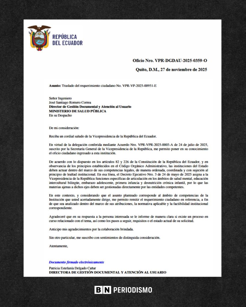 La institución indicó que, según la normativa vigente y el decreto ejecutivo 3, sus responsabilidades como vicepresidenta se limitan a la articulación de políticas públicas en ámbitos como salud mental, primera infancia, educación intercultural, embarazo adolescente y desnutrición infantil, por lo que el requerimiento fue derivado a las entidades competentes.