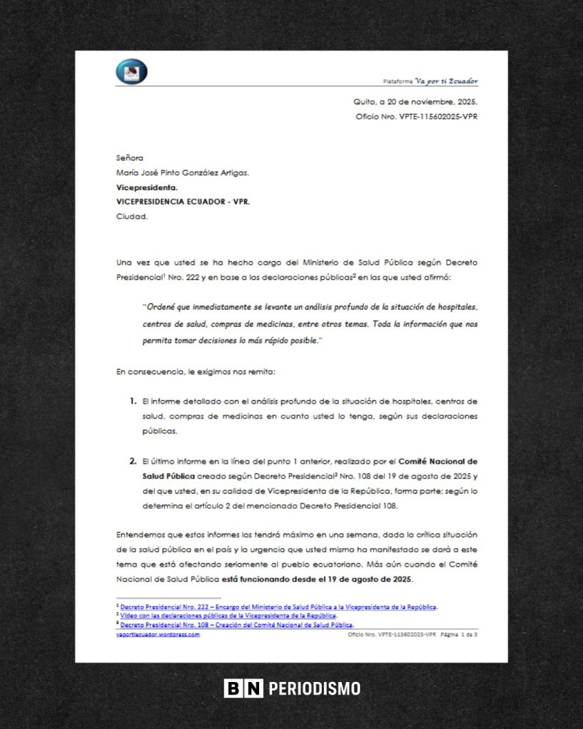 La CNA interpretó esta respuesta como un intento de evadir responsabilidades, recordando que Pinto preside el Comité Nacional de Salud y, por tanto, debería revisar la información entregada sobre proveedores y contratos observados entre 2019 y 2025. El organismo anticorrupción también solicitó que se analicen las denuncias relacionadas con el eventual contrato del IESS con la plataforma HealthBird, estimado en USD 37,7 millones. Su coordinador, Germán Rodas, expresó preocupación por la falta de claridad en quién ejerce efectivamente el liderazgo del Ministerio de Salud, tras la respuesta emitida desde la Vicepresidencia.